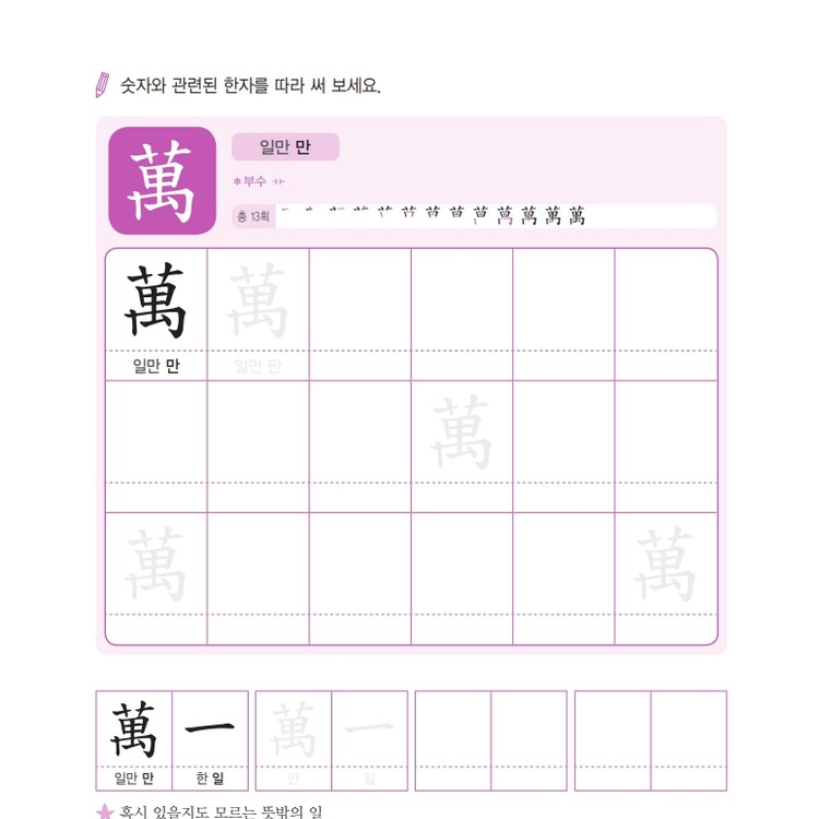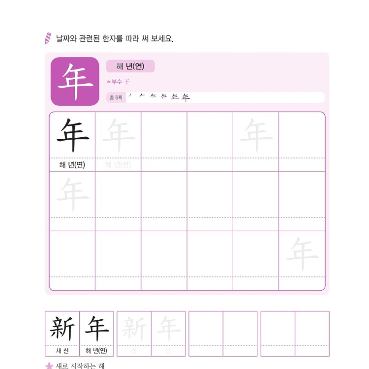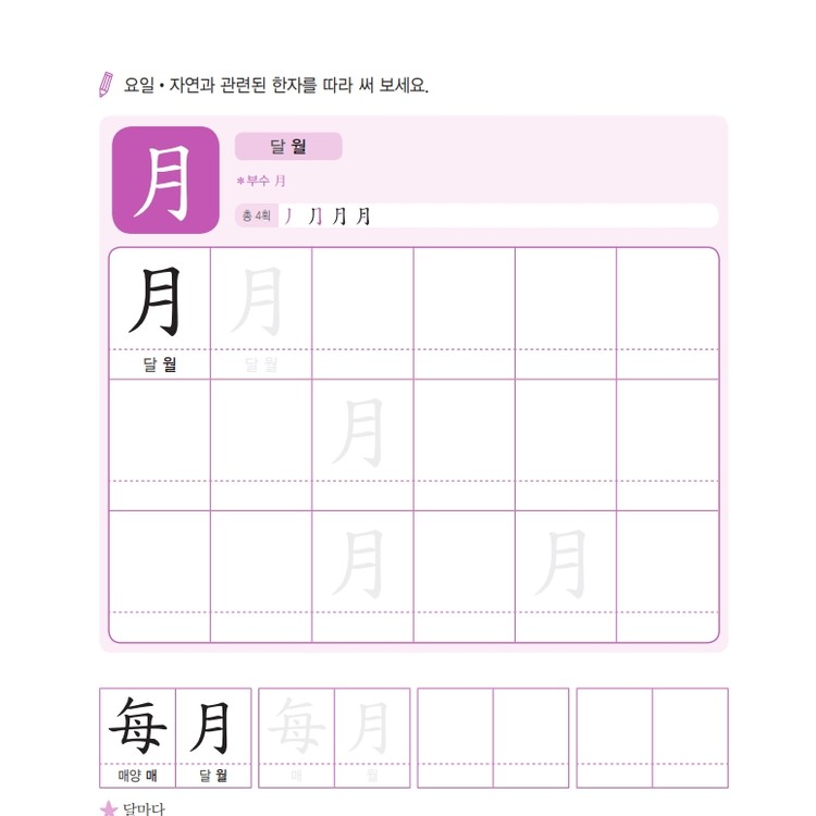 따라쓰기는 단순 반복 대신 한자가 포함된 어휘를 함께 쓰며 학습 효과를 높여요.