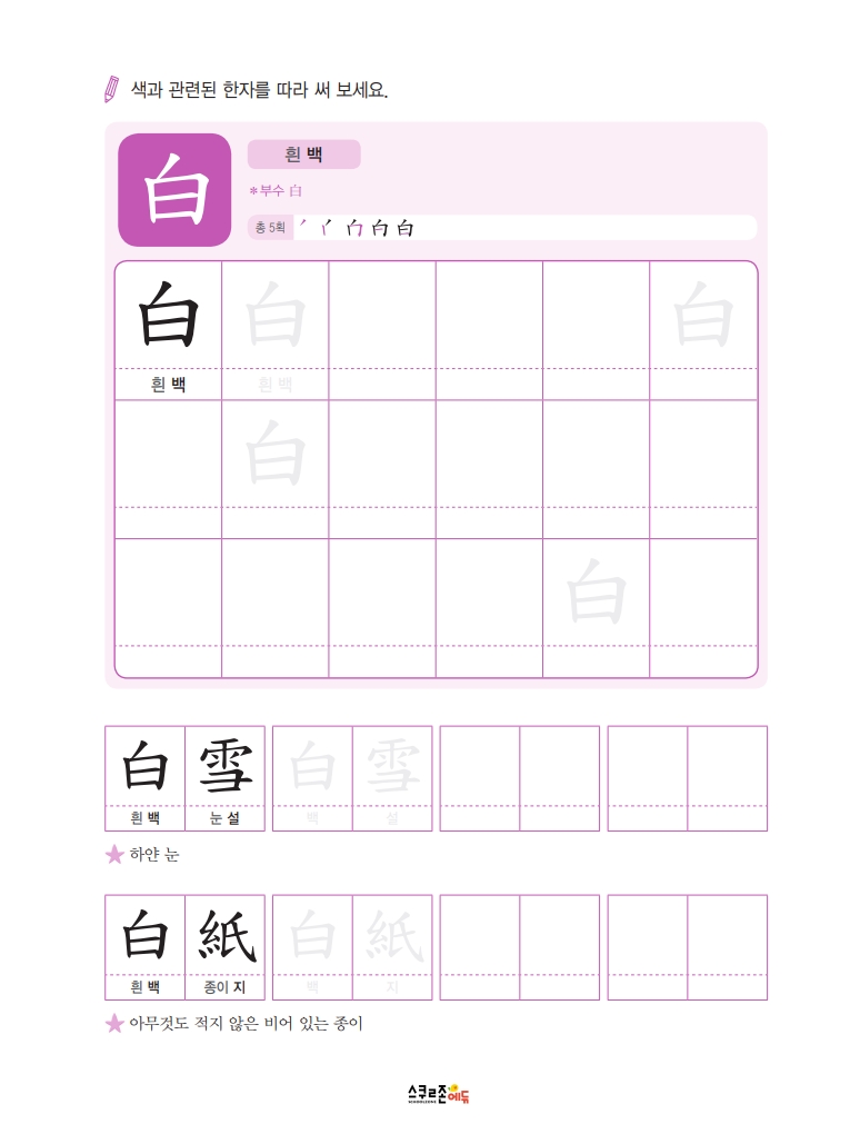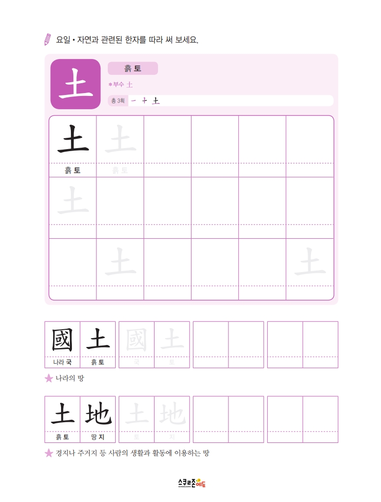 따라쓰기는 단순 반복 대신 한자가 포함된 어휘를 함께 쓰며 학습 효과를 높여요.