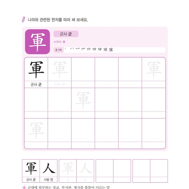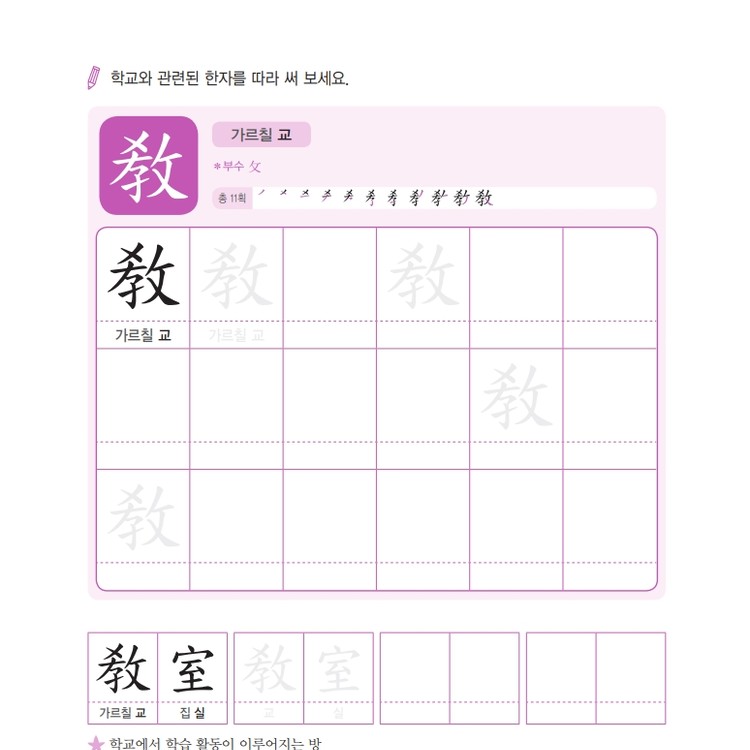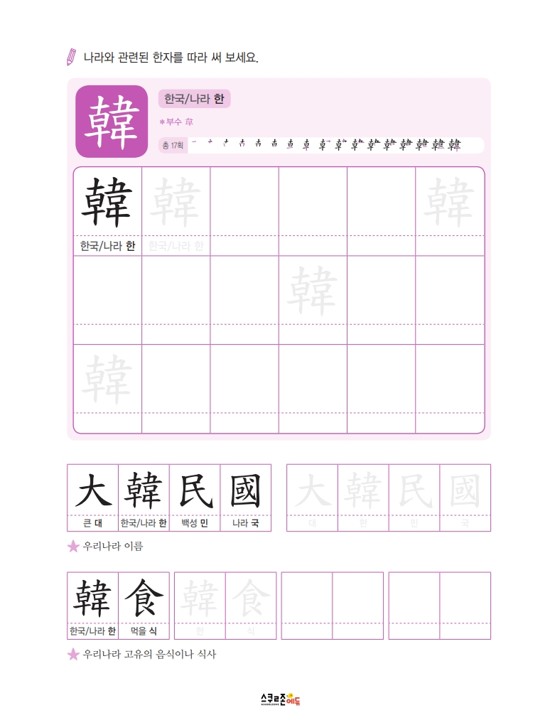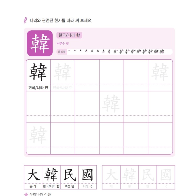 따라쓰기는 단순 반복 대신 한자가 포함된 어휘를 함께 쓰며 학습 효과를 높여요.