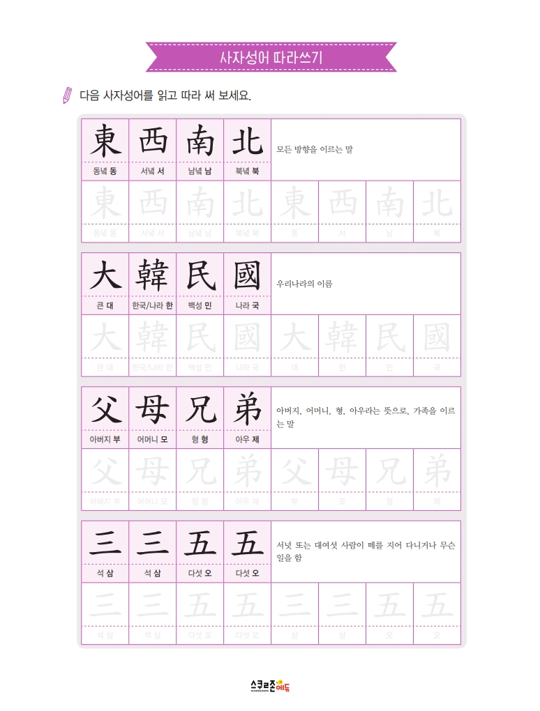 따라쓰기는 단순 반복 대신 한자가 포함된 어휘를 함께 쓰며 학습 효과를 높여요.