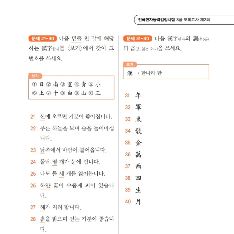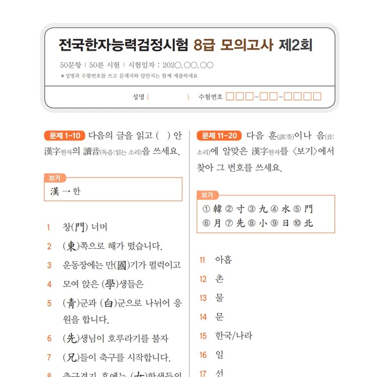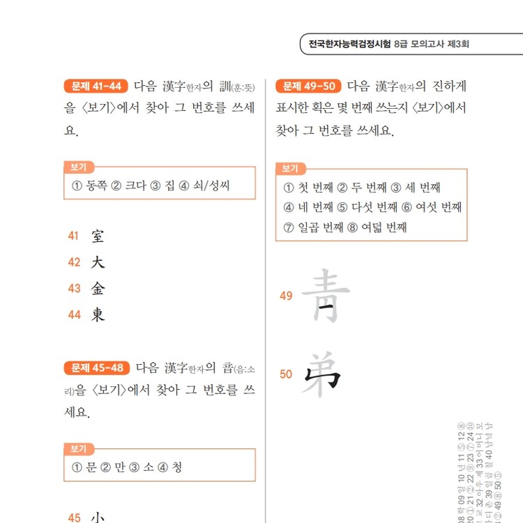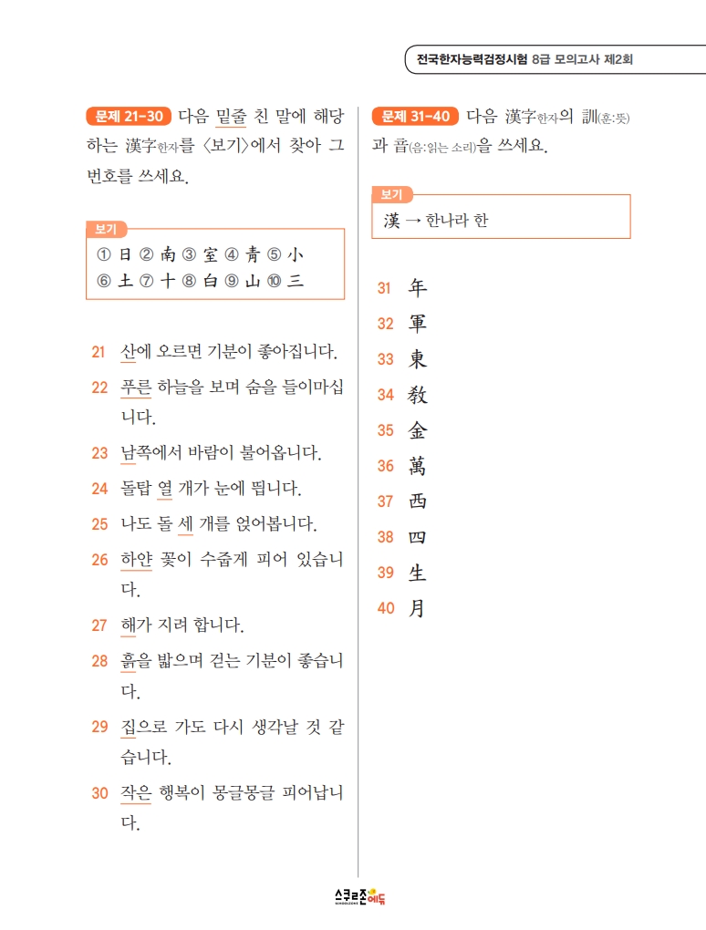 문제집은 표지의 8급 한자를 먼저 읽으며 기초를 점검하고, 문제풀이에 들어가요.