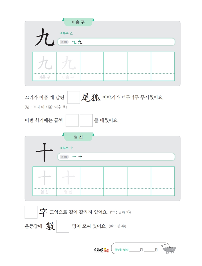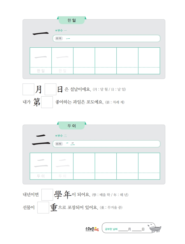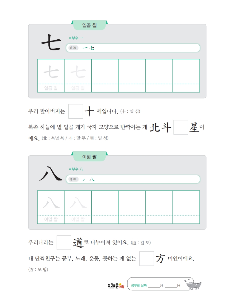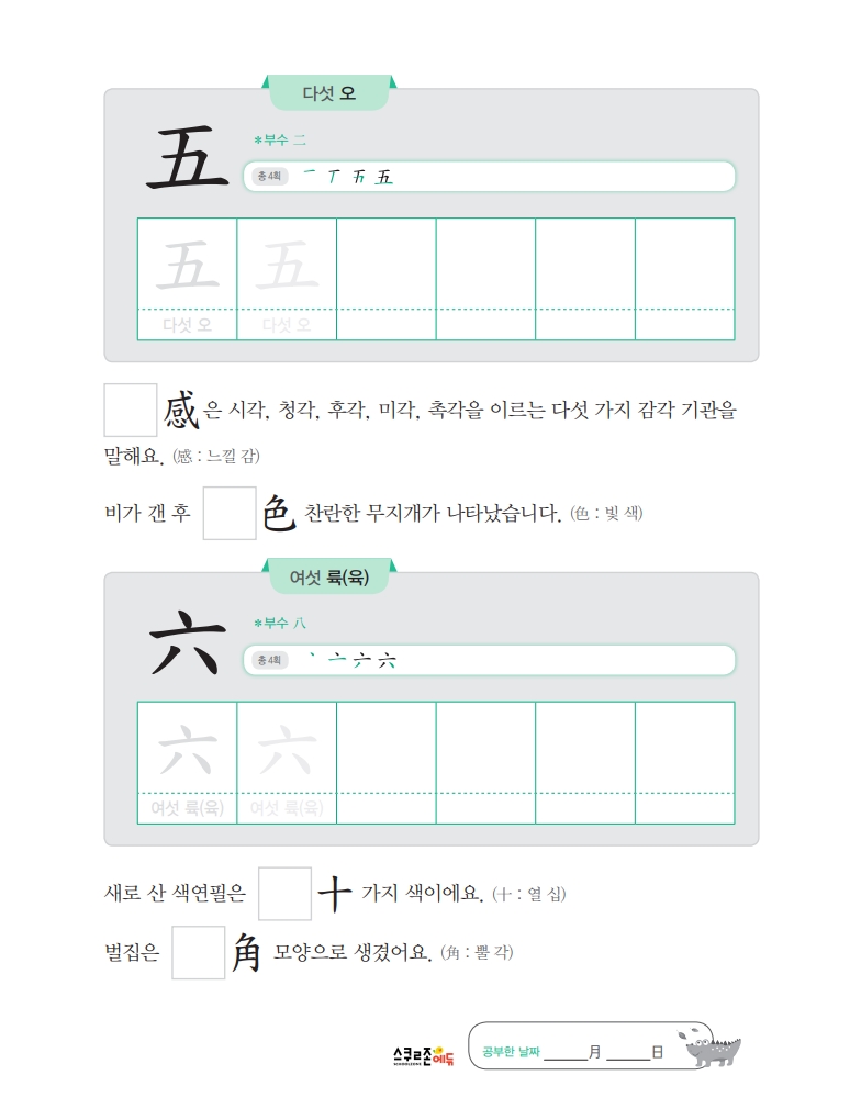 익힘책은 하루 5분, 하루 2자씩 5주간 학습하도록 구성, 한자의 기본인 부수를 익히고,