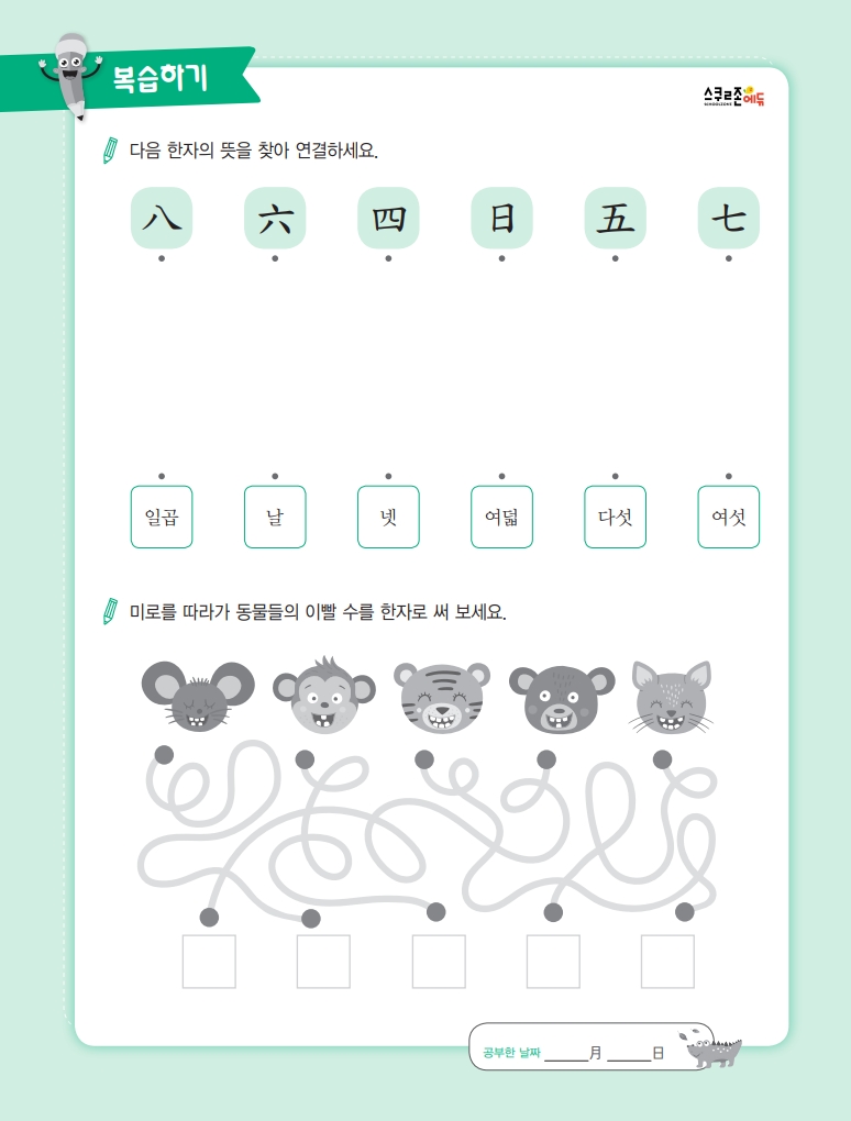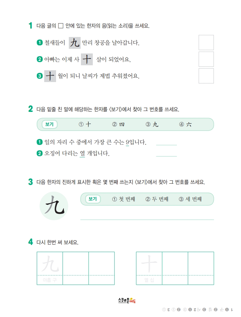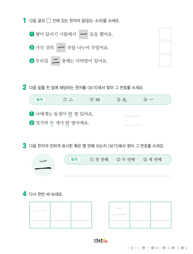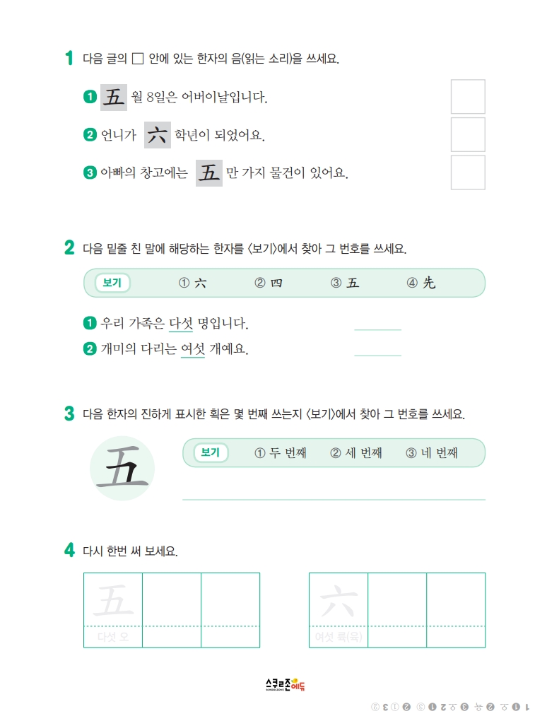 익힘책은 하루 5분, 하루 2자씩 5주간 학습하도록 구성, 한자의 기본인 부수를 익히고,