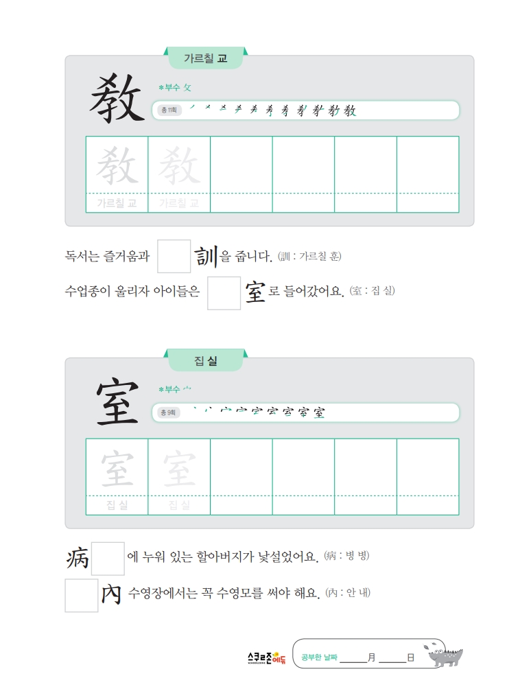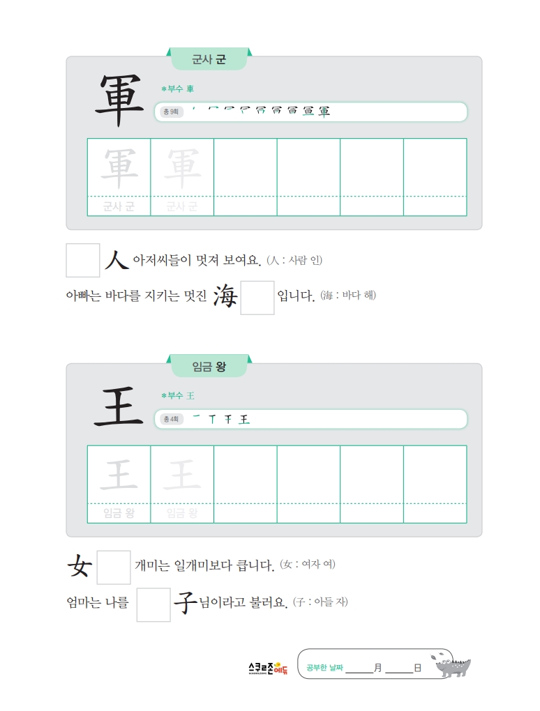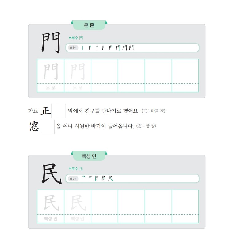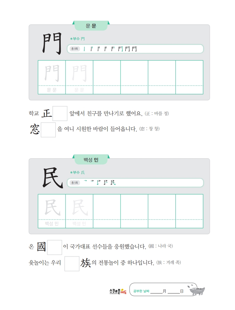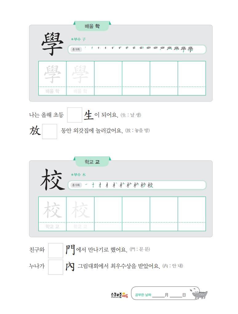 익힘책은 하루 5분, 하루 2자씩 5주간 학습하도록 구성, 한자의 기본인 부수를 익히고,