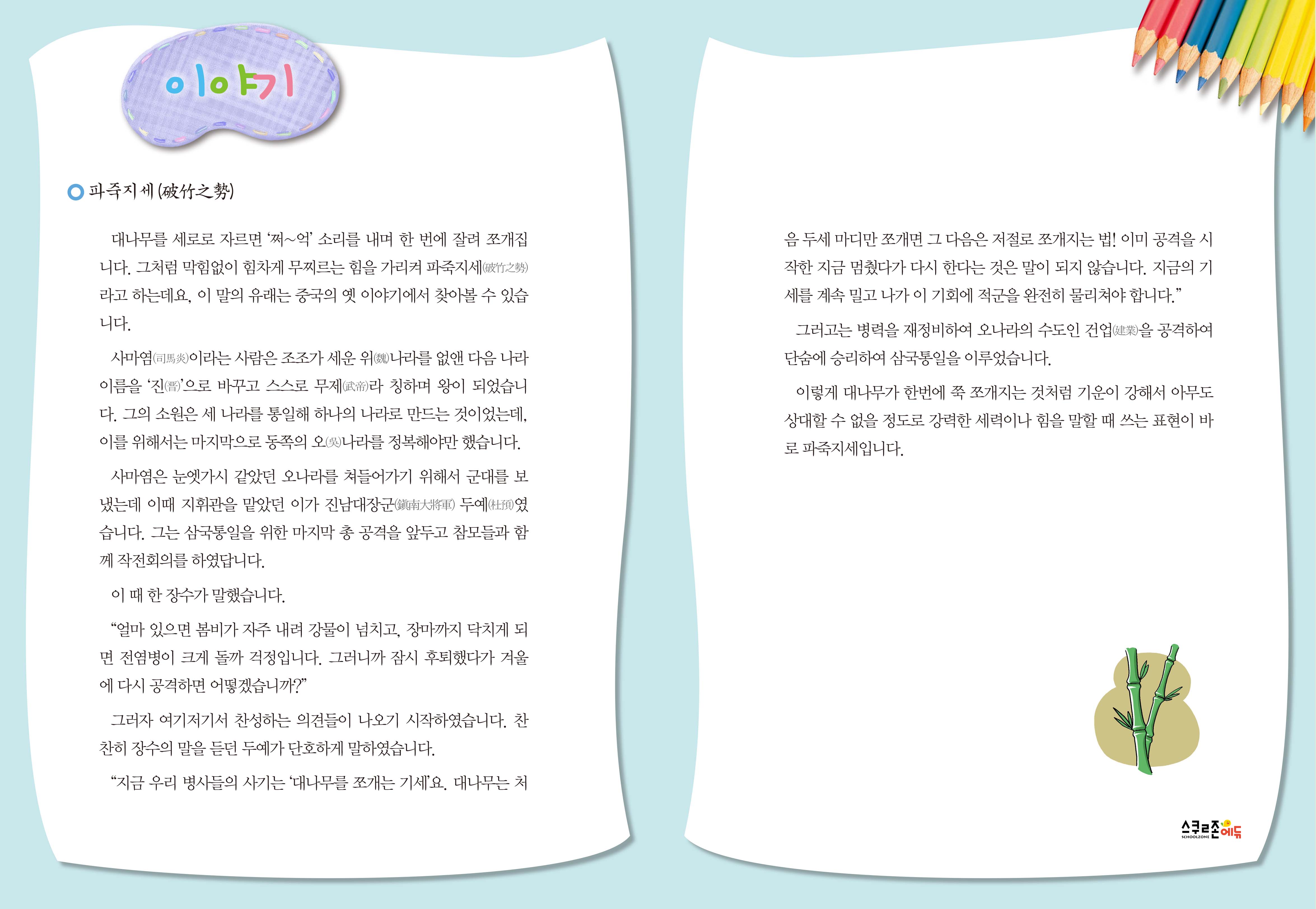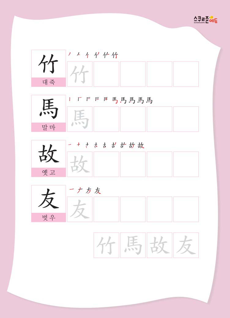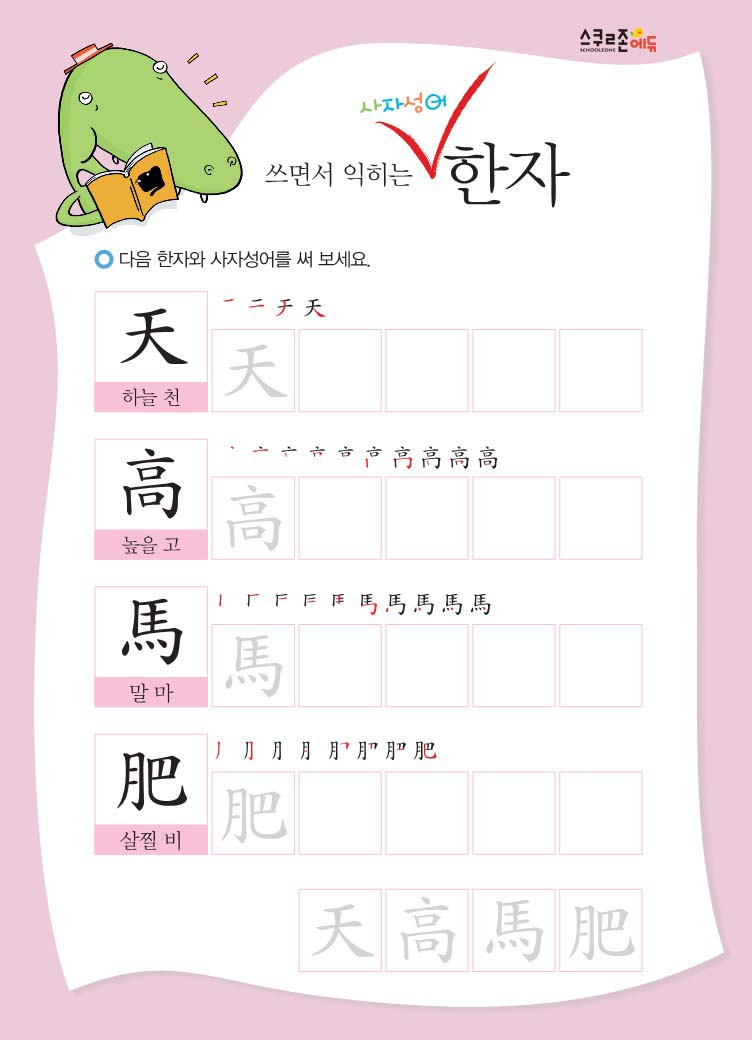 한글과 한자를 함께 쓰고, 유래 이야기와 예문을 통해 자연스럽게 의미를 익힙니다.