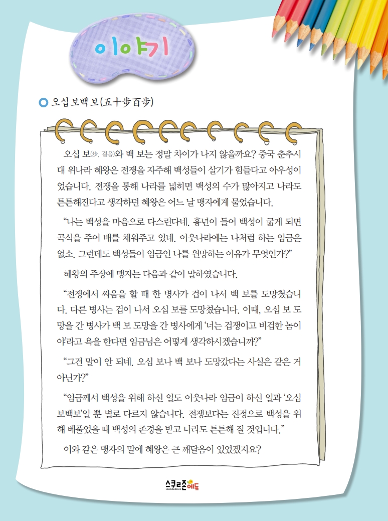 한글과 한자를 함께 쓰고, 유래 이야기와 예문을 통해 자연스럽게 의미를 익힙니다.