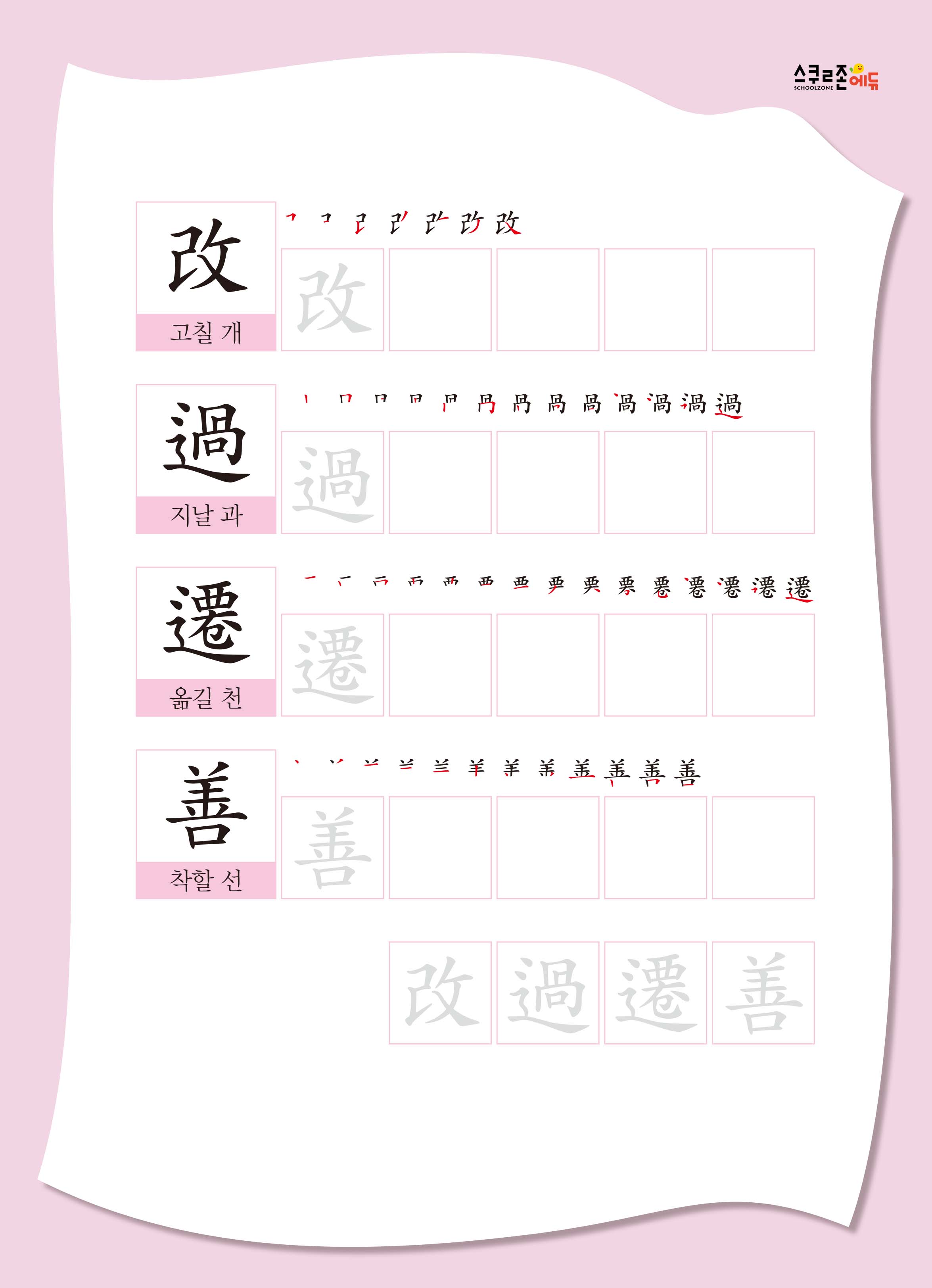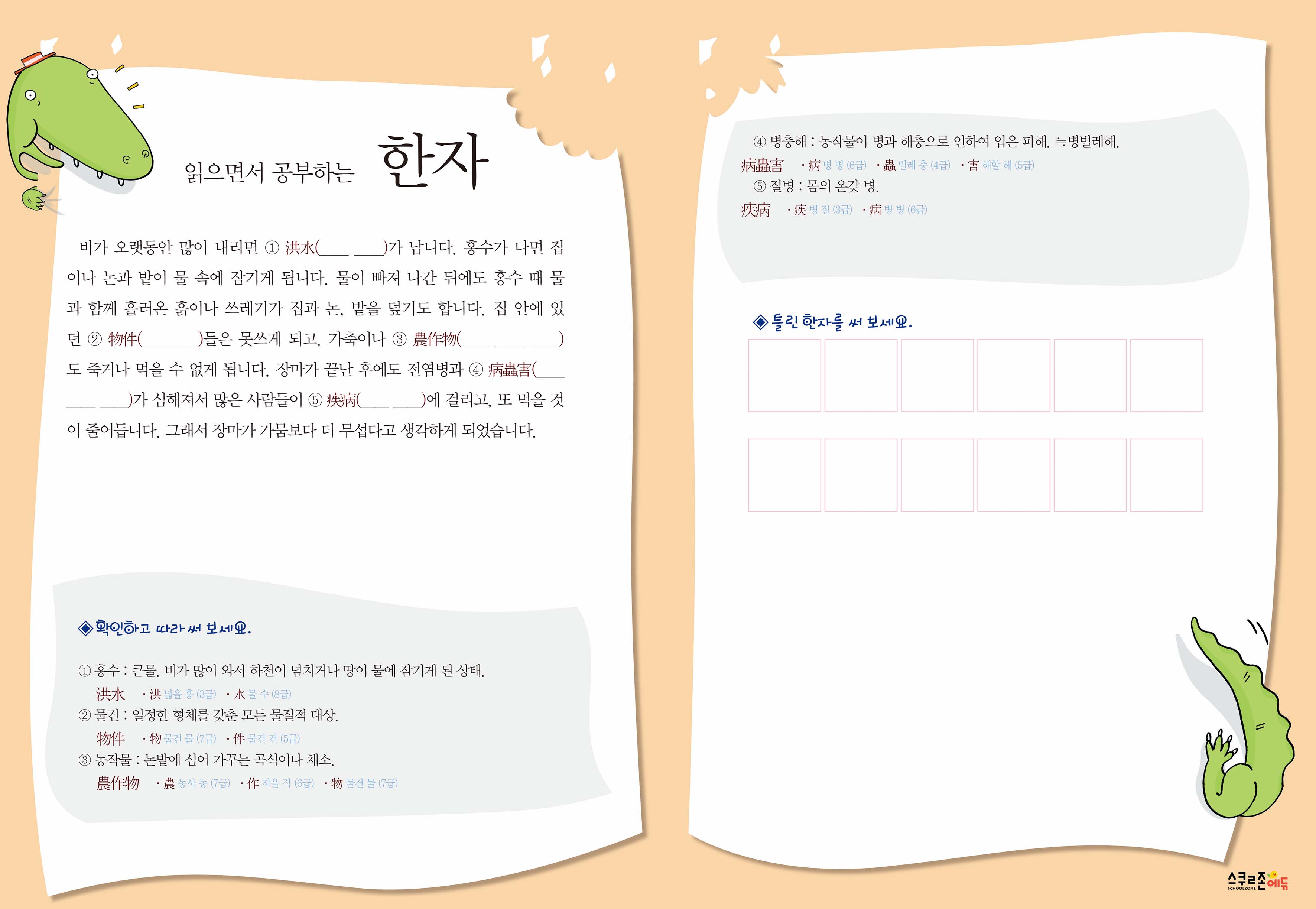 한글과 한자를 함께 쓰고, 유래 이야기와 예문을 통해 자연스럽게 의미를 익힙니다.