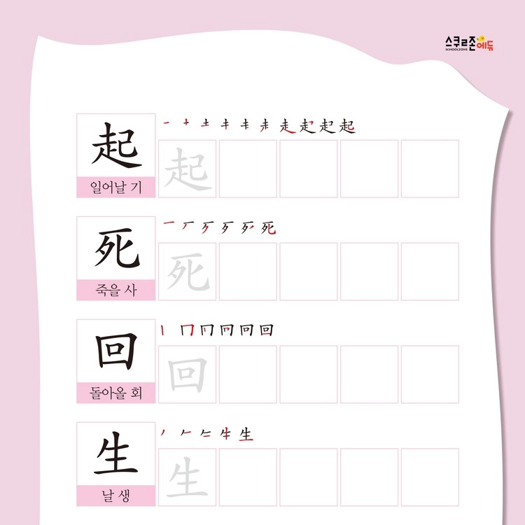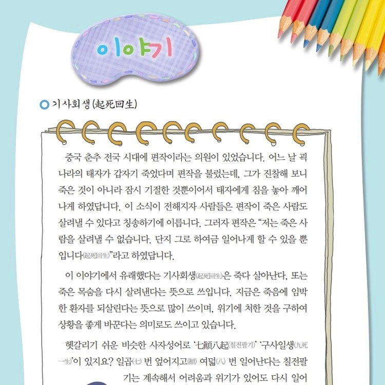 한글과 한자를 함께 쓰고, 유래 이야기와 예문을 통해 자연스럽게 의미를 익힙니다.