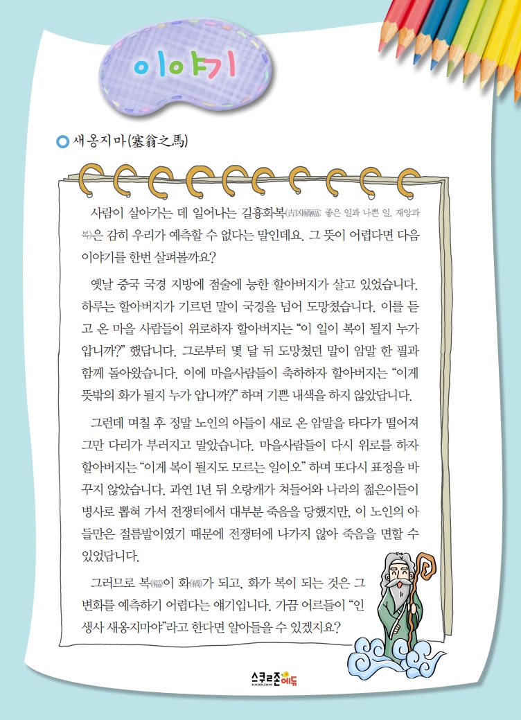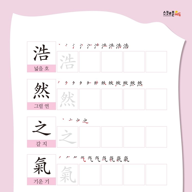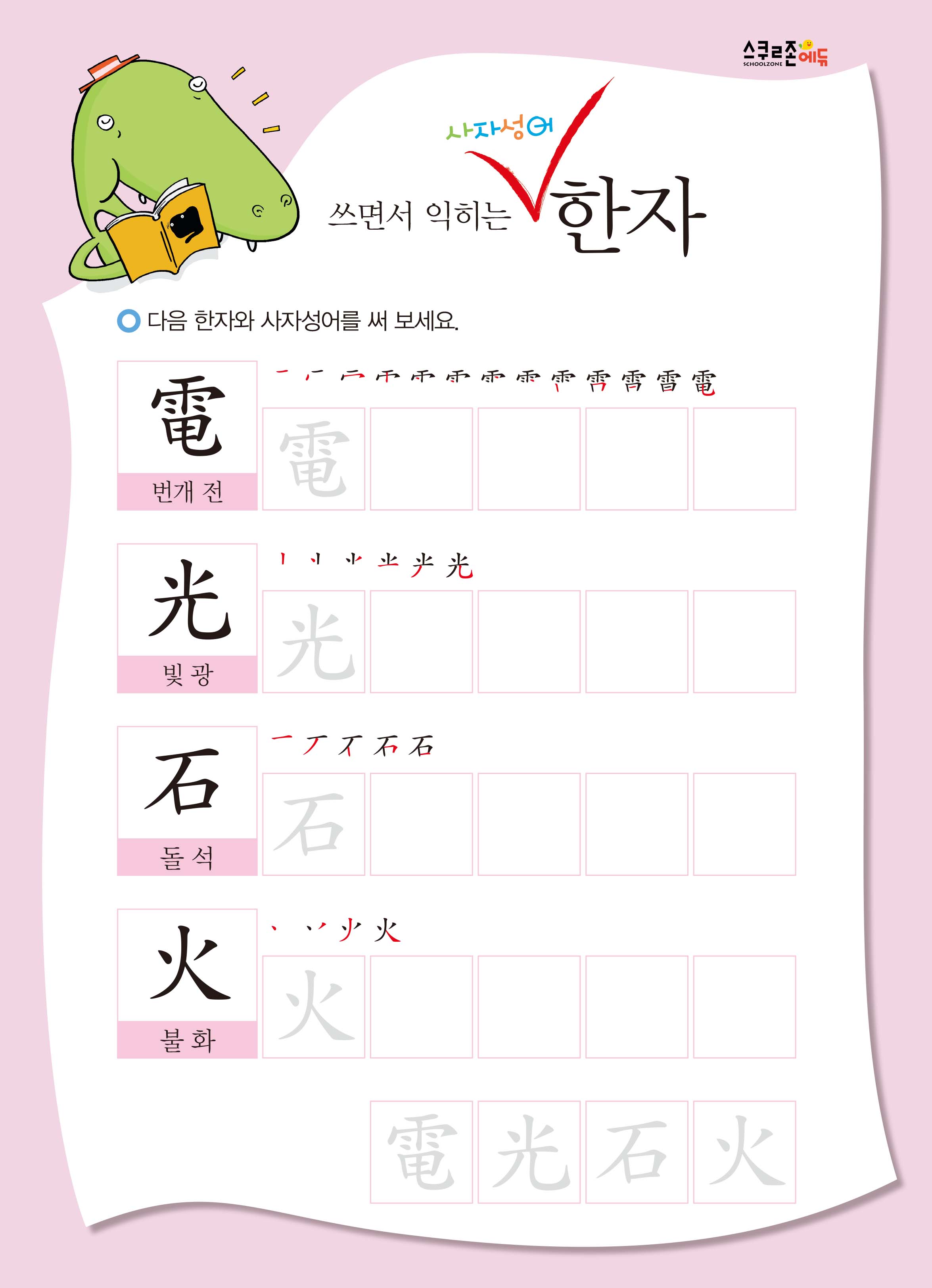 한글과 한자를 함께 쓰고, 유래 이야기와 예문을 통해 자연스럽게 의미를 익힙니다.
