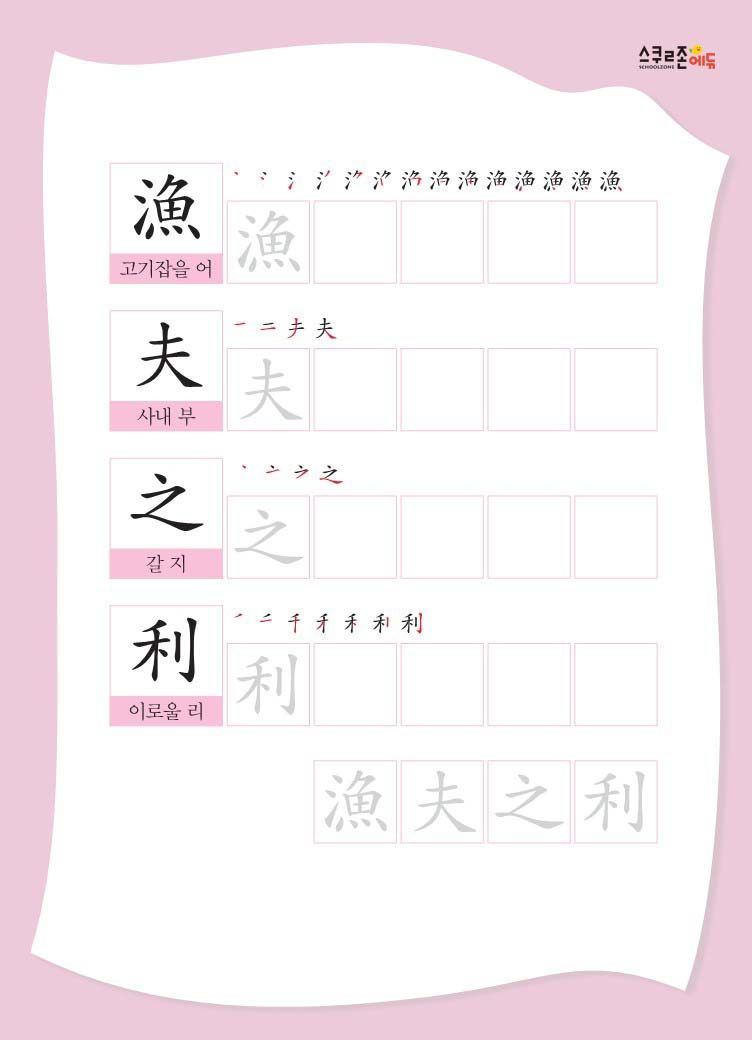 한글과 한자를 함께 쓰고, 유래 이야기와 예문을 통해 자연스럽게 의미를 익힙니다.