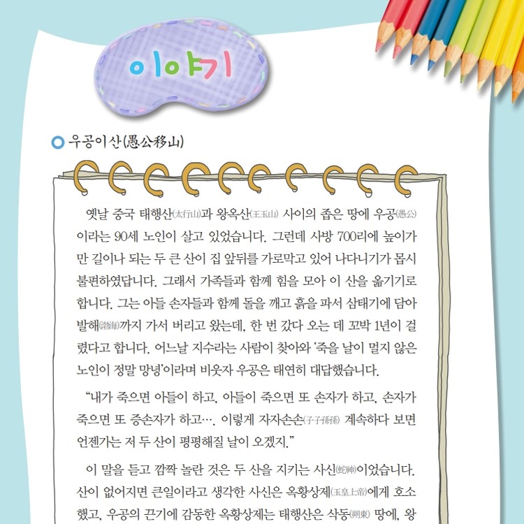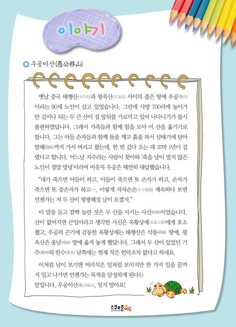 한글과 한자를 함께 쓰고, 유래 이야기와 예문을 통해 자연스럽게 의미를 익힙니다.
