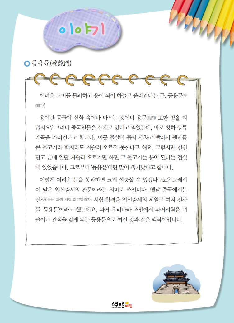 한글과 한자를 함께 쓰고, 유래 이야기와 예문을 통해 자연스럽게 의미를 익힙니다.